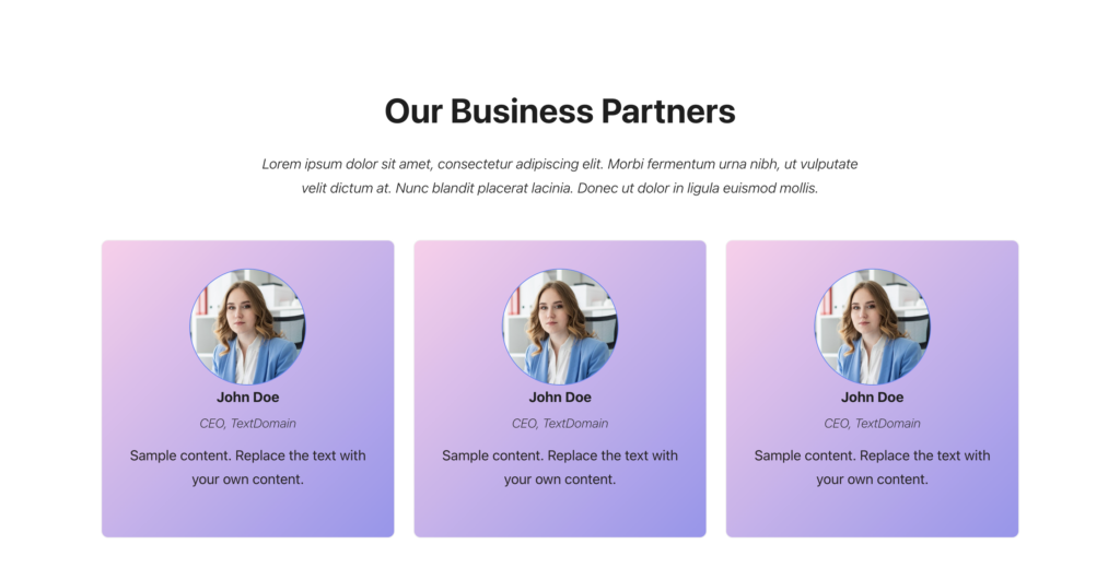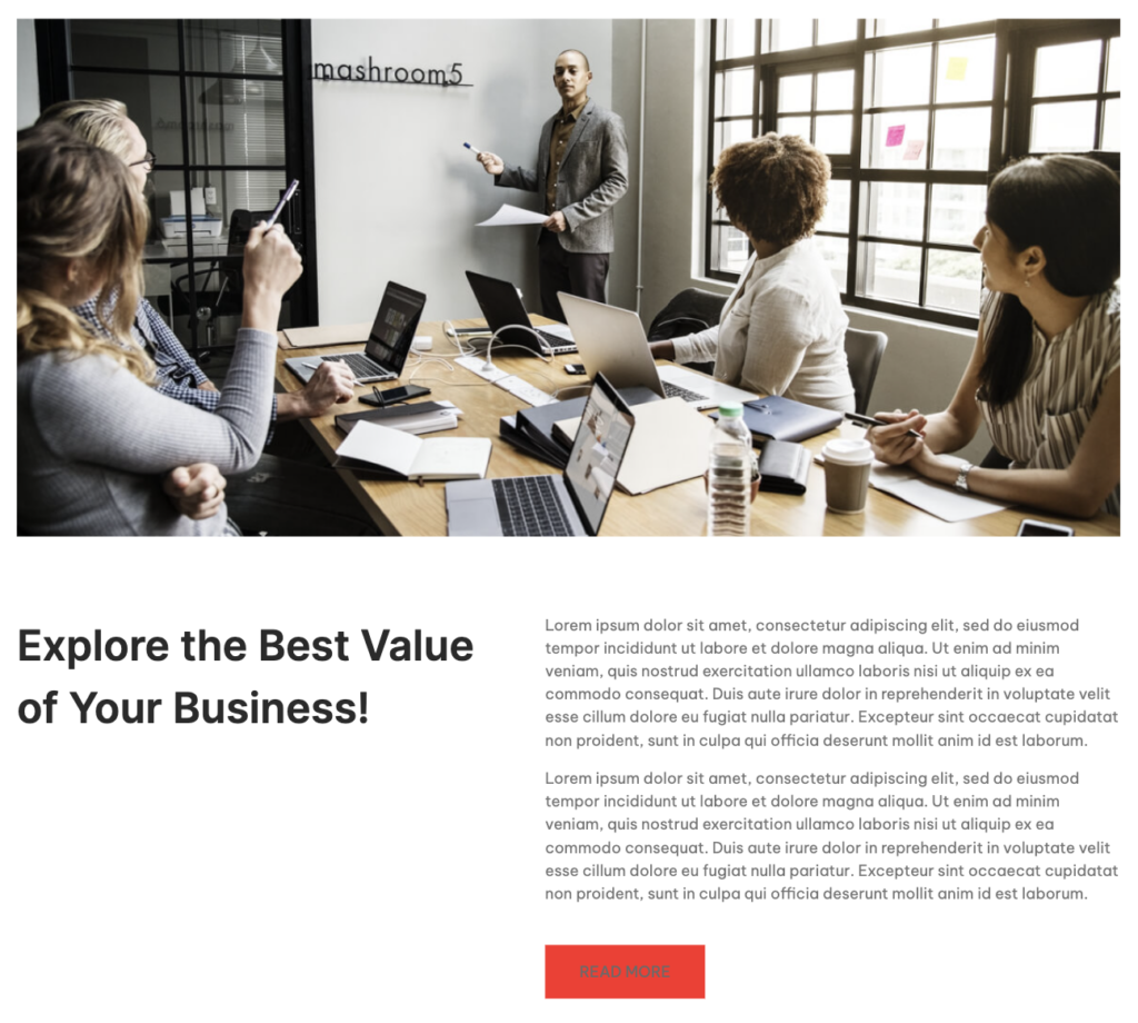 Unlike Grabber, this theme has many more patterns that can be utilized. An example is this pattern (below) that isn’t used on the initial home page that appears when you first download the theme. As said, our client wants a hero image on nearly every page so a pattern for an about page that already has a hero image is helpful.
