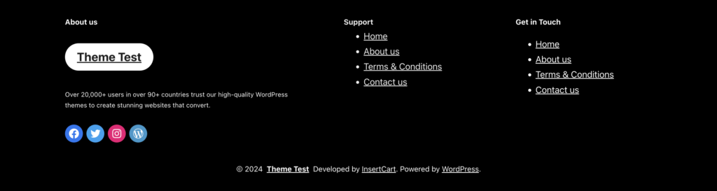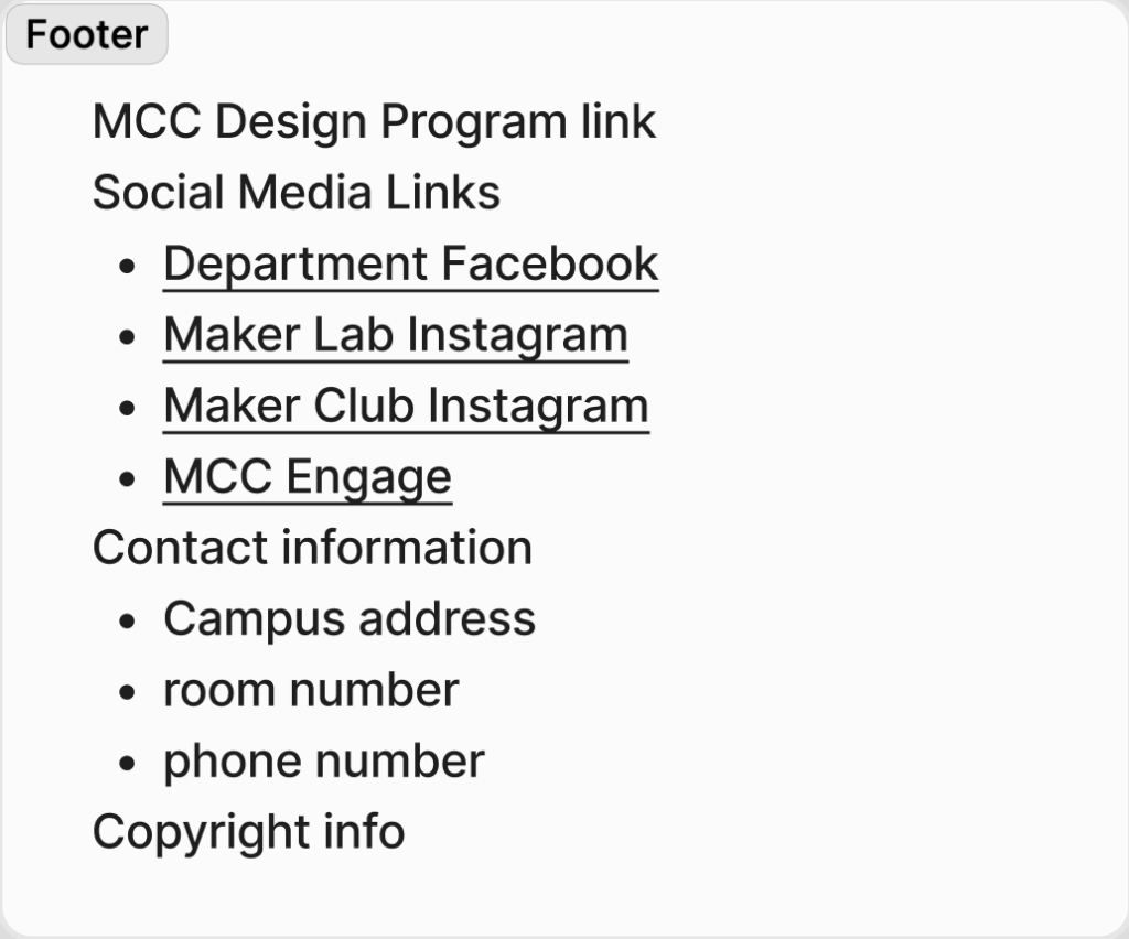 Below is the footer. There are icons for social media already there which can link to the department social media. ‘Get In Touch’ can display the contact information. In addition, the small bit of text underneath ‘theme test’ (which can become a link back to the home page) can be a place to add the MCC design program and any other links that aren’t social platforms.