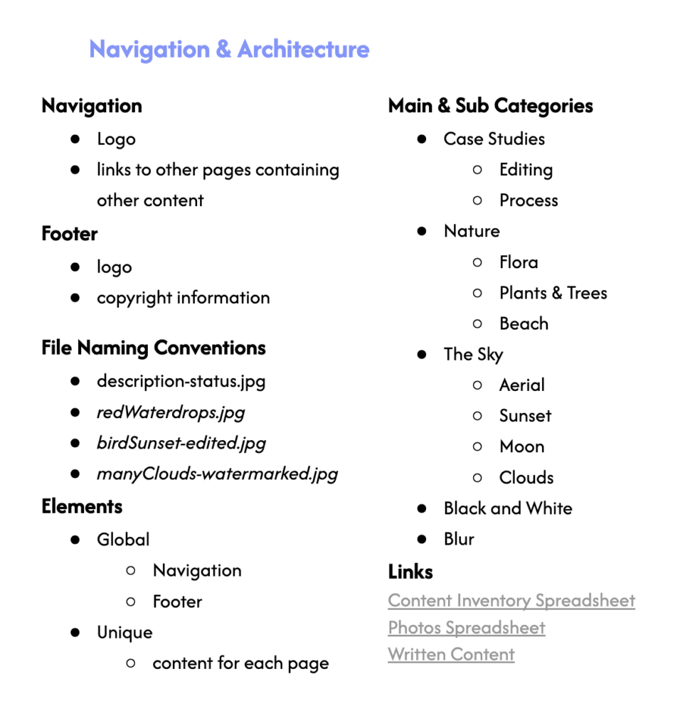 Finally, I created links to documents that I would need in the future. These included a Photos Spreadsheet where I’d keep track of the status of my photos, a Content Inventory Spreadsheet to keep track of what changes I’ve made to pages and posts once production has started, and a Written Content Document for writing the content for the Case Studies.
